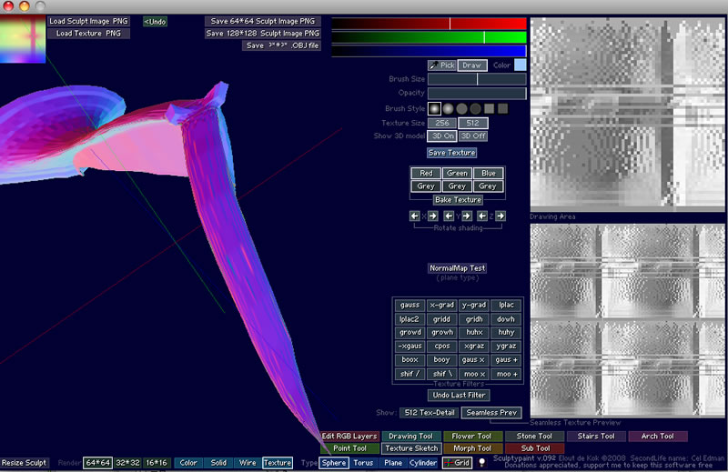 ドラゴンの外皮〜グルルっっとな制作記♪「其の2」 Factory Report 2009年10月21日 ::: O.F Dragon/Cry & Fire! :::最初に、前回の記事でドラゴンが鳴かなかったとコメントを頂いたので、突貫制作ですがファイヤーなムービーを用意してみました。よかったらご覧ください。まだ炎も鳴き声も調整しますが...::: O.F Dragon Suclpted Map :::続いて、オレンジ製品のテクスチャ及びサウンド制作行程について問い合わせがありました。本当に我流でテクニカルになりきらないとは思いますがご要望に対して掲載という形でお答えしたいと思います。■ドラゴンの制作行程より外皮テクスチです。ドラゴンに関してのスカルプテッドプリムの造形とデザインはミューズさんが担当しています。この辺のプロダクトデザインなど造形に関わる分担はどちらか一方であったり、合作であったり製品によって成り行き的に決まってきます。分かりやすい製品で言いますと、スピーダシリーズがオビワン、他はミューズさん、飛行船は合作デザインという感じです。その、デザイン担当のミューズさんより O.F Dragon 最終プロトタイプ段階のスカルプマップ1セットが届きました。ここからオビワン本格的にお仕事開始となる訳ですが、256X256dpi で書き出して送付してくれた分手間が1工程省けるので大助かり♪とか、喜んでいます。これがアップロードの64X64dpiサイズだと書き込みベースに使う時拡大しますからドットのギザギザをスムージングする手間が省けますし、位置が正確な感じもします!これは光線からテクスチャに陰影を付ける時使うsculptypaint で読み込む行程でも助かります。::: sculptypaint/ Drgon Wing :::光源設定・テクスチャサイズ(512,256)・テクスチャカラー(Gray設定)この辺りを選んだらBake Texture ボタンを押し良ければSave Texture で書き出します。そして、使い慣れた Fireworks にて上記のスカルプマップをベースにグリッドマップを重ね上から表皮のテクスチャを書いて行きます。この時、細部の書き込みはインワールドで撮影した実プリムのスナップ写真を参考にします。ある程度書けたところで、この陰影テクスチャに暈しやスムージングをかけ上から焼き込み系のフィルター設定で陰やシワを重ね込んで行きます。この陰影は、結構濃く付けないとインワールドではその効果が見えにくく、そのため陰影テクスチャのレイヤーコピーを複製し、陰の深さと濃さを調整出来る様に双方に焼き込みと加算フィルターを設定して陰の加減を調整しています。外皮テクスチャがそこそこ出来たらAC3Dに読み込んでアップロード前に見栄えや位置・方向ズレを確認して、修正を当てて行きます。ここはエンゼル・チビーダでの行程が参考になると思います。テクスチャとして完成したらインワルードにアップロードして貼付ける作業を部位の数だけこなすことになる訳です...うぅ。。先が長くも感じてきました。。肝心の外皮の層についてはまだこれからなのですが、ドラゴンって毛並みか、ウロコか,,,それとも恐竜系の猛獣肌かっ??という段階で試行錯誤しています(笑)O.F Dragon はホワイトとダーク系を作る予定ですから、少しがんばってみたいと思います。作業工程を紹介すると言っても、こうして書いてみるとかなり分かりにくいと思います。画像ソフトはFireworksですし、AC3Dやsculptypaintというマイナー系のソフトを多用していますから...ただ、どれも安価でありシェアウエアーやフリーウエアーだったりします。作業工程は非効率な部分も否めませんが、手になじんでいるツールであり費用対価はSLでは抜群だと思えています。次回は鳴き声サウンドの制作の続きから、DAWソフトでの音圧を稼ぐ設定とモノラルファイル書き出しあたりをご紹介いたしますね。by オビワン http://orangeforest.blog.shinobi.jp/factory%20report/%E3%83%89%E3%83%A9%E3%82%B4%E3%83%B3%E3%81%AE%E5%A4%96%E7%9A%AE%E3%80%9C%E3%82%B0%E3%83%AB%E3%83%AB%E3%81%A3%E3%81%A3%E3%81%A8%E3%81%AA%E5%88%B6%E4%BD%9C%E8%A8%98%E2%99%AA%E3%80%8C%E5%85%B6%E3%81%AE%EF%BC%92%E3%80%8D%20ドラゴンの外皮〜グルルっっとな制作記♪「其の2」