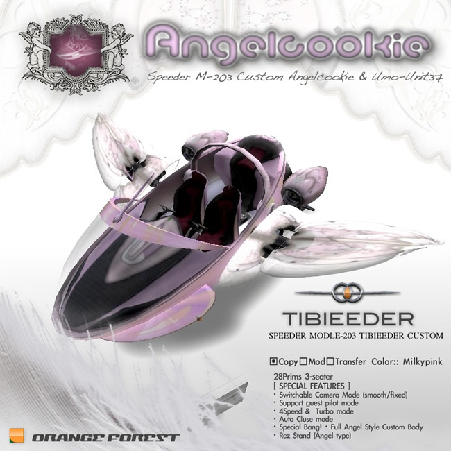 Custom Tibieeder Angel Cookie 本当の意味での完成です! Customise Notes 2009年08月25日 ::: Custom Tibieeder Angel Cookie ::: SPEEDER M-203 Custommina Cookie 様のカスタマイズ・チビーダ エンゼルクッキー号の完全版いよいよフィニッシュです。マイルドな飛行特性のエンジンも通常の 203型エンジンへと進化しています。操縦もなれたと聞いていますので、ターボも4倍で搭載!やんちゃにぶっ飛んでいただけるものと思います。*前回納品したCustom Tibieeder Angel Cookie(マイルド飛行エンジン版)はこちらをご覧ください。このクッキー号をベースにエンゼルホワイト&ブラックを制作したため、相違点が山ほど出てしまいました。テクスチャは元よりボディサイズも若干違ったためメカニカルなスタンドまでも調整が必要となり、すべて洗いざらいに手を入れていたので時間がかかってしまいました。。::: Sky Yard /Angel Cookie ::: 翼に腰掛けて最終チェック中::: Sky Yard /Angel Cookie ::: 好きなアングルから:ぽってりとかわいいw今回はカスタム作業の間、ずっとスカイヤードで作業をしていました。朝焼けや夕日に目を奪われて、刻々と変わるSLの空模様を楽しんでいた時間の方が長かったかもしれません....後はミューズさんの噴射炎のカラー変更と最終チェック、そして梱包を待つのみです。ミナさん大変お待たせいたしました。近日中に納品いたしますー次は、リカさんの「愛欲の赤黒天使号」....た、たしかそんなお題だったと記憶しています。。血の赤でしたよね、苺ってお題も聞いていたのですが気にしなくてもいいのかな(笑)なんにしてもたいへんお待たせしました、がんばります!!by オビワン http://orangeforest.blog.shinobi.jp/customise%20notes/custom%20tibieeder%20angel%20cookie%20%E6%9C%AC%E5%BD%93%E3%81%AE%E6%84%8F%E5%91%B3%E3%81%A7%E3%81%AE%E5%AE%8C%E6%88%90%E3%81%A7%E3%81%99%EF%BC%81%E3%80%80Custom Tibieeder Angel Cookie 本当の意味での完成です!