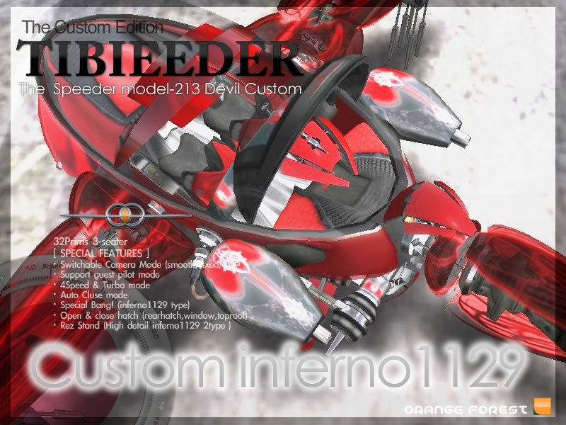煉獄の赤 デビルチビーダ・カスタム完成しました! Customise Notes 2010年08月26日 :::O.F SPEEDER Model-213 Tibieeder Custom / inferno1129 :::こんにちは、オビワンです。rica さんのカスタムオーダー「inferno1129/煉獄の赤 デビル・チビーダ」がやっとやっと完成しました!この機体はカスタマイズオーナー様から市販のOKもいただきましたので、色・仕様違いのタイプも発売する予定です。::: inferno1129/A type stand :::■TIBIEEDER Custom/inferno1129 カスタムオーナー :: rica Andelカスタムベース :: O.F TIBIEEDER M-203 (Angel Editions)カスタムオーダー :: 血の赤・ダンテの煉獄炎・儚い消失効果・デビルのしっぽ!カスタムオーナー様の flickr photostream には可愛らしい写真とともにチビーダのスナップも掲載をいただいてます。ありがとうございますヾ(´⌒⌒*)Flickr:: http://www.flickr.com/photos/31290121@N02/カスタマイズにあたってメカチックで随天使的な要素も多分に含んだエンゼルチビーダをベースとし、今回はリファインを主に施しました。いただいたテーマ血の赤、デビルのシッポ、ダンテなイメージの消失効果とサウンドを製作、そして勝手に専用のデビルエンブレムをデザインし各所に配してあります。■ボディウインドウ回りをリファインしスピーダシリーズでは初のクローズドボディを採用。■スタンドRezで出現するスタンドはデビルのシッポと羽根を含めてメカニカルに表現、可動ギミックは備えてませんが、レズラー方式で2タイプのスタンドをRezできます。スタンドのオブジェクトは200prims程のハイプリムな構造ですが、出現させると45m以内の人(アバター)を感知して自動的にレズラーを作動/停止させます。これによりSIMに常時レズラーの負荷をかける事無く、土地には低プリムで飾っていただける方式になっています。デビルなスタンドは、機体・羽根・しっぽ・地面などあちこちに座る事ができます♪ ■ハッチクローズ型ボディを採用のため、マニュアル&自動開閉機能付きのハッチを装備しました。ルーフはスライドオープン、サイドウインドウはアップダウン、リアハッチはリフトアップ、と一度に3カ所3様の開閉をします。機体をRezするとスタンバイ状態でオープン、搭乗でクローズする自動モードと、マニュアル操作での開閉ができます。また、後部座席への搭乗を感知すると自動でリアハッチを消失させます。■飛行最後になりますが、メインはやはり飛ぶ事です!最新式のオレンジフォレスト オリジナルのホバー飛行エンジンスクリプトを搭載し、誰でも簡単に操縦と操作が楽しめます。 楽して飛びたい方には :: オートクルーズ もっと楽をしたい時には :: スイッチパイロット(操縦者交代機能) カッ飛びたい方には :: ギアチェンジモード(4速切り替え最速はクレージー) ブッ飛ばしたい方には :: ターボモード(ターボブースとで加速が4倍増) 人を煙に巻きたい時には :: 7色のカラフルスモーク 人を驚かせたい方には :: 爆破消失wなどなど、他にも機能を搭載していますので楽しい飛行をお楽しみいただけることでしょう。オーナーが搭乗するとスタンドは自動消失します。オプションのアタッチメントを装着していただくと、ハイディテールなデビルの羽としっぽをまとったまま飛行を楽しんでいただけます。■カスタマイズ仕様についてカスタマイズ機体ですので、煉獄炎の赤いカラーリングと専用エンブレム、オリジナルの「はかない」消失効果、「ダンテ」な消失サウンド等はこの一機となります。市販バージョンでは多少の仕様の違いが生じます。☆今後のリリース予定白・黒そして紫のデビル・チビーダ【仮名】を発売する予定です。::: inferno1129/B type stand :::Airship Factory *Ginza* 銀座 ・http://slurl.com/secondlife/Ginza/38/25/31只今 納品を控えたこちらの カスタムチビーダ inferno1129 号を銀座の飛行船ファクトリーに展示してあります。ごらんになりたい方はご自由におこし下さい! あ! 整備ドック風の展示をしてありますので頭上にはご注意下さいませ(笑)by Obione. http://orangeforest.blog.shinobi.jp/customise%20notes/%E7%85%89%E7%8D%84%E3%81%AE%E8%B5%A4%20%E3%83%87%E3%83%93%E3%83%AB%E3%83%81%E3%83%93%E3%83%BC%E3%83%80%E3%83%BB%E3%82%AB%E3%82%B9%E3%82%BF%E3%83%A0%E5%AE%8C%E6%88%90%E3%81%97%E3%81%BE%E3%81%97%E3%81%9F%EF%BC%81煉獄の赤 デビルチビーダ・カスタム完成しました!