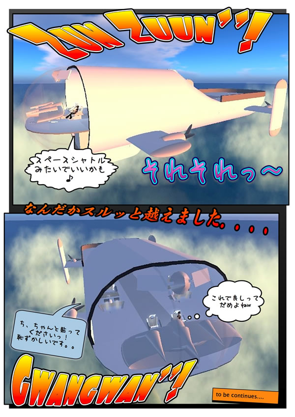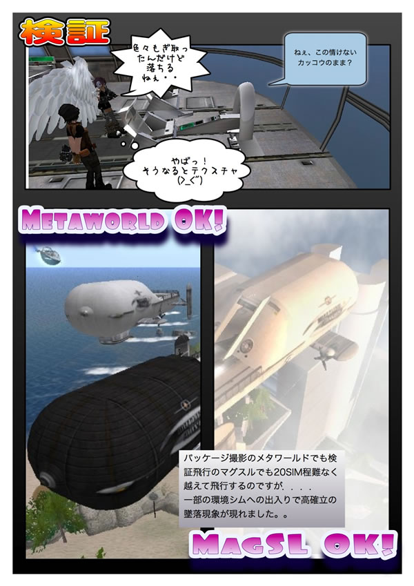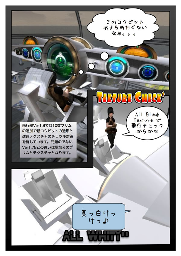テスト機体と完成版の差異は、追加プリムと貼り込んだ新装テクスチャが一番の相違点となり、昨夜はミューズさんと現地にて「パーツをもぎ取っては落ちw」の飛行検証となりました。。