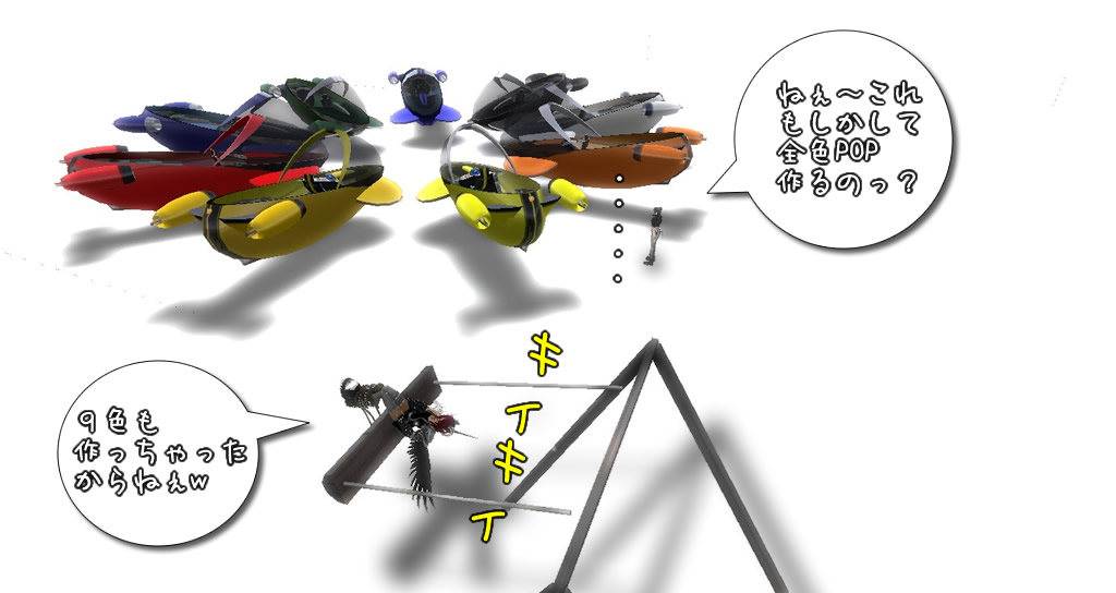 1,2機Rezして置いてみると、もう10年程前になるのでしょうか...PCとしては衝撃的にカラフルだった5色のiMacを思い出しました。 すぐさま9色を円形に並べてこのホワイトアウトした空間で撮影したい衝動にかられ、先ず出来上がったのがインワールドのベンダーとは角度の違う Hot Red のベンダーPOPです。