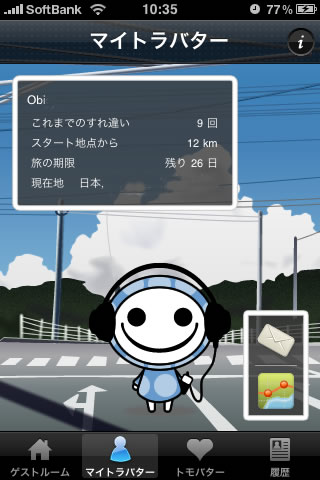 自分のアバターが一月間のあいだ誰かのiPhone を渡り歩いて気ままな旅に出かけるというアプリだそうです。。