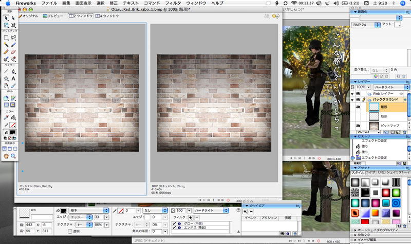 そうだ森にいこうっ♪ Travel 2009年01月10日 ☆ 刻忘れの森 ☆ 仕事始めの日報「其の3」カスタム・スピーダをと思っていましたが、ちょっと筆休めをして散策&製作日記を綴ります。日報「其の2」でご紹介した最近の製作物、オレンジ・ゲストハウス製作の参考にと、某メタバース・コンシュルジュ ケイさんのメタバース リズームSIMにある新居を訪れてみました。。「刻忘れの森」と名付けられたその場所はリゾームの高台から城壁の様にまもられ、幾種もの木々に囲まれていました。そして、もう春を思わせる様な あで紫の蝶が舞い 小鳥のさえずりが聞こえてきます。 この界隈は北欧の田舎町のような風景が広がっています。ウッディでヨーロピアンクラッシックなお洒落な家は、日差しの傾きと共に風情を変えていき、一人ガーデンにたたずんで時のうつろぎに身をまかせていると、その名のとおり 刻(とき)を忘れされてくれるかの様でした。とは言え、ワークデイなので時間を忘れて癒されてるままにはいきません。お家のテクスチャーを観察してみるとRLの採光とは違う4隅を囲む陰影を入れてあり、これがあるほど SLでは趣がでてそれらしく見えるんだ・・・と、今更ながらに発見しましたw 例えば煉瓦壁なら煉瓦のベースレイヤーにインナーグローをかけるとか、中心をくり抜いたレイヤーを上に重ねフィルターと透明度で古味や煤けの風合いを加味するとか...方法は多岐に渡ると思います。この辺は好みの問題もあり、さじ加減もむずかしそうでやり過ぎてもくどくなるでしょう。。 では、思い立ったら検証ですw::: 煉瓦壁テクスチャ製作画面 :::ちなみにこれはオレンジ・ゲストハウスの煉瓦テクスチャ製作画面です。オビワンはごらんの様に、MacBookでファイヤーワークスをメインで使っています。他のソフトでも操作は似た様な物だと思いますが、SLにログインしたまま裏で作業するのに断突に安定していて機敏にサクサク動きます。フォトショップやGIMPも使う時があるのですが、重く突然落ちるので困る時があります。使っていて特に楽なのはファイル書き出しの早さと作業ファイルの保存フォーマットがPNG形式なので透過ファイルは書き出す必用すらなくアップロードできるため時間の節約にもなる点です。この元のテクスチャはRL北海道旅行/函館で撮影した赤煉瓦写真を縦横方向の歪みを修整しシームレス加工にしてあります。写真そのままでは生々しくて部分的に浮いてしまいますから、煉瓦レイヤーを複製して重ね、上部側にフィルター(ぼかし)と(ノイズ)をかけ2枚の差の絶対値を抽出したものを適度にブレンドしたり彩度を落としSLでなじむよう少しだけ絵画調に加工してあります。今回はそのファイルを読み込みベースにしました。 本画像上部には雨だれ&煤けを出す為に錆びの画像を加工し煉瓦レイヤーの上にブレンドモード(焼き込みカラー反転)で乗せてあります。両サイドは画像範囲外左右に短形を置きシャドウを内側に落とし、両スミの陰影を加えてあります。下部は同じく短形にクシャクシャ和紙をテクスチャに割当てブレンドモード(ハードライト)で地面からの土跳ね汚れと風化の感じを加えてみました。後はそれぞれの効果をレイヤーごとに増加減して、趣をどの程度加えるのかとか調整すれば出来上がりです。これらの趣や風合いをもっとハデに加えたいのなら効果のレイヤーをブレンドモードで(乗算)(減算)で処理するとギラっとなります。中途半端なテクニカルな記事になってしまいましたが本当に我流です・・・すみません。みなさんはどうやってこんな風合いを出しているのだろうと思いながら、いつもあてずっぽで製作してます(^^ゞ とかいいながらも5分程でチン♪と出来ましたw散策で参考になった点を盛り込み、作り替えテクスチャを貼り込んでみると.... あ、なんだか良い感じになりました!自己満足ですけどw散策したかいがあったということで〜そして、どこかに新居祝いでつくってあげた看板があるはず!と思い出しせっかく来たので探してみました。 ありました!あ、でも・・・ ときわすれのもり♪と表示を間違えています。 親切の押し売りは本意ではないのですが,ちゃんと「寝落ちの森♪」に直してあげましたw飛行機屋さんなのですが、時々こんなものも作ったりしてます。。最近アニメーションのコツが少し分かってきて駄作ながらもプチにハマっていますw☆ 寝落ちアニメーション付き看板w ☆ そして某ケイさんのご依頼で作った、名古屋NPOコンサルティンググループ さんの看板です。☆ おっとっとアニメーション付き看板w ☆ どこかでみかけたらゼヒ座ってみて下さい(^-^)お散歩にも森林浴にもお洒落なローケーションなメタバース・リゾームSIMはこちらです!http://slurl.com/secondlife/Rhizome/16/176/28オレンジも銀座に半額シャンペーンで入居しましたが。ただいまメタバースシム群では空き区画情報を公開しレンタル用地の入居者を募集しているそうです。広い土地の半額キ